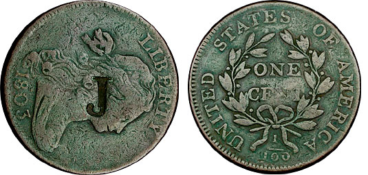 This Draped Bust Large Cent is counterstamped with a simple “J” on the obverse.