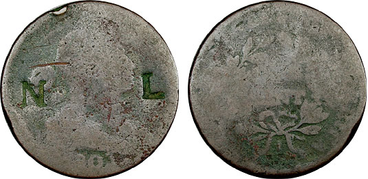 This nice and original Draped Bust Large Cent is counterstamped on the obverse with “N” on the left and “L” on the right.