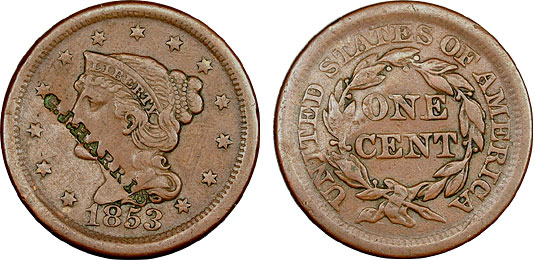 1853 1c US Coronet Large Cent Counterstamped – G.J. HARRIS