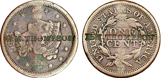1856 1c US Coronet Large Cent Counterstamped – H.M. THOMPSON