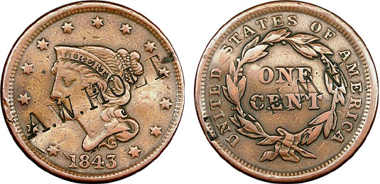 1843 1c US Coronet Large Cent Counterstamped – A.W. HOLT
