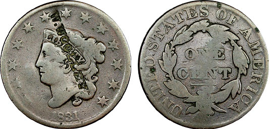1831 1c US Coronet Large Cent Counterstamped – W.WOOLLEY