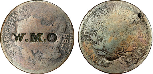 This nice 1798 Draped Bust Large Cent is counterstamped on the obverse with “W.M.O.”