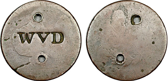 This Draped Bust Large Cent is counterstamped with “WVD” on the obverse with two holes.