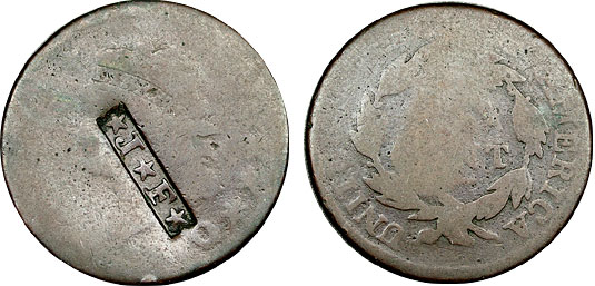 This Classic Head Large cent is counterstamped on the obverse with “*J*F*”. Not necessarily asterisks but it’s the closest ASCII character to what is counterstamped on this fabulous Large Cent.