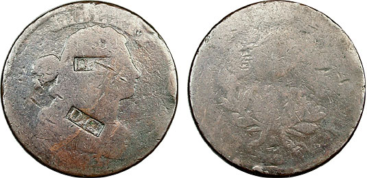 This beautiful original Draped Bust Large Cent is counterstamped on the obverse twice with “DC”.