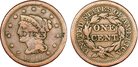 1850 1c US Coronet Large Cent Counterstamped – CN. DICKSON