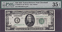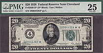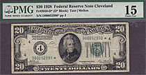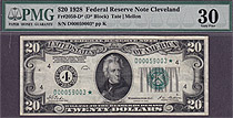 Here is a 1928 Cleveland $20 Star note in a problem free PMG VF-25 holder. The serial number is D00044364*. This note list for almost $2,000 in UNC....