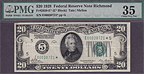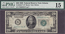 Here is another scarce 1928 $20 FRN Star from the tough Atlanta district. There were only 76,000 printed and even fewer releaded. It is in a PMG F-15 holder. The serial number is F00006354*. No rips, tears or pinholes....