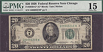 Here is a 1928 $20 FRN STAR from the Chicago District. The serial number is G00086249*. It is in a PMG-15 holder. There are no rips, tears or pinholes....