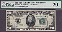 This is a nice 1928 $20 FRN STAR from the St Louis Distric. It is in a under graded PMG VF-20 Holder. The serial number is H00040085*....
