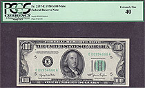 This is one of the key notes in the 1950 $100 series. It is from the Richmond district with no rips, tears or pinholes. The serial number is E00954666 and it is in a PCGS EF-40 holder....