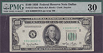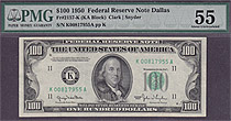 Here is a real nice 1950 $100 FRN Green seal Dallas note. The serial number is K00817955A. It is in a PMG-58 holder. the plate numbers are K11/116. Mule notes have a back plate number of 112 and lower....