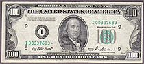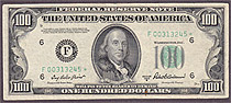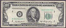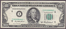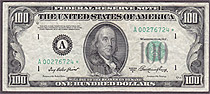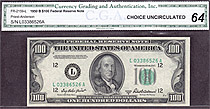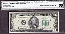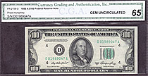 I bought this 1950A $100 Dallas Star note on March 8th, 2004. This is one of only a handfull UNCs known on the district and series. The serial number is K00160584*. There are no rips, tears, pinholes or bank marks. It features great margins and superb emb...