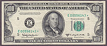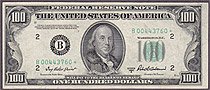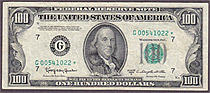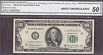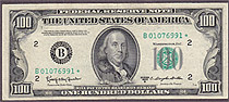 I bought this 1950A $100 Dallas Star note on March 8th, 2004. This is one of only a handfull UNCs known on the district and series. The serial number is K00160584*. There are no rips, tears, pinholes or bank marks. It features great margins and superb emb...