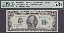 Here is a real nice 1950 $100 FRN Green seal Dallas note. The serial number is K00817955A. It is in a PMG-58 holder. the plate numbers are K11/116. Mule notes have a back plate number of 112 and lower....