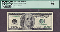 Fr.-2175 1996 $100 San Francisco Ser. # AL77777777B PCGS VF-30