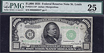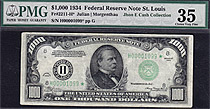 PMG POP 2/1 finer. This rare 1934 $1,000 FRN star note is from the fine city of St Louis, MO. There are only 5 known from this district. This PMG VF-35 is the 2nd finest of the 5 graded by PMG, the other one higher being a PMG-40. I find it hard to believ...