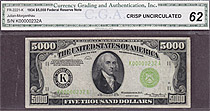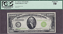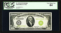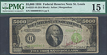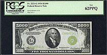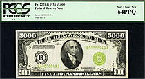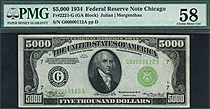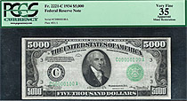 This 1934 $5,000 FRN note has the WOW factor. The WOW meaning it is one of the few $5,000 notes of all grades to have earned a PPQ designation. That means this new to the market note has never been cleaned, pressed, repaired, restored or doctored with in ...