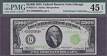 This is a super nice 1934 $5,000 FRN from the Chicago district. This is of the light green variety. This is one of the nicer Chicago $5,000 notes I have owned. There are no issues with this one at at. There are no rips, tears, pinholes or bank marks. It ...