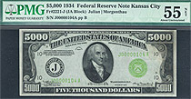 This 1934 Kansas City $5,000 Note sold before I could put it on the website. I wanted to at least show what it looked like.The serial number is J00000104A and is in a PMG 55 NET holder....