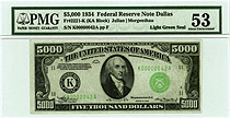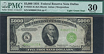 This is a very nice and rare problem free 1934 Dallas $5,000 bill in a PMG VF-30 holder. It is also the rarer Light Green Seal variety. This is the first problem free $5,000 bill I have has in some time. The $5,000 bill is becoming very hard and expensive...