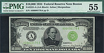 This is a 1934 $10,000 FRN from the tough Kansas City district. It is also a more desirable Light Green Seal variety. The serial number is J00000319A and it is housed in a PMG-25 NET holder. This is the top of the line for currency collectors. The largest...