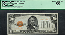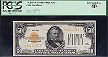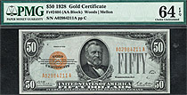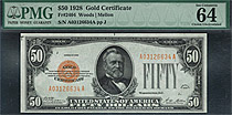 Fr.-2404 This is a very nice example of the 1928 $50 Gold Certificate in a PMG-64PPQ holder. Of all the 1928 gold certificates, the $50 denomination is the hardest to acquire in uncirculated condition. The $10 and $20 gold certificates are more common ...