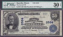 Here is another 1902 $50 Date Back from The First National Bank of Daneville, Ill. The Charter number is 113 and the Bank serial number is 1862. It is in a PMG Fine-12 holder. There are only eight of...
