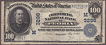 This is a 1902 Plain Back $100 from The Commercial National Bank of Peoria, IL. The Charter is 3296 and the serial number is 2813. Track and Price says there are 16 known. There are 6-7 pinholes that I can see. The large scans with the zoofify feature w...