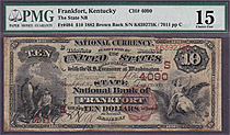 Here is a Fr.-484 or a 1882 $10 Browb Back wit a Charter # of 4090. It is from The State Nationa Bank of Frankfort, It has been graded at a PMG F-15. THERE ARE ONLY FOUR OF THESE 1882 $10 bROWN BACKS KNOWN FROM THIS BANK....