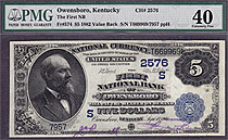 This is a very nice 1882 $5 Value Back from The 1st National Bank of Owensboro, KY. The serial number is 7967. It has been graded as a PMG EF-40. The Charter # is 2605. There are only 4 known on the bank. This is almost a perfect note with ample margins a...
