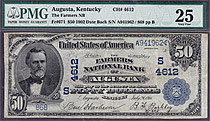 This 1902 $50 Date Back from The Farmers National Bank of Augusta, KY is graded a PMG VF-25. Centered close at the top with nice color and decent paper quality. There are no rips, tears or pinholes. Super strong signatures with the Vice President signing ...