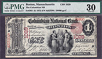 This is a very rare Note. It is an 1875 $1 Original from the Columbian National Bank of Boston. It is UNLISTED in Kellys new book. It is the Second Finest Known on the bank from this series. These type notes have completely dried up, period. Try acquiring...
