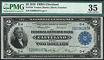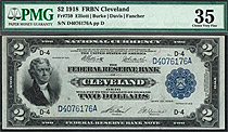 Fr.-758 This is a very fine example of the famous 1918 $2 Federal Reserve Bank Note commonly referred to as the Battleship because of its World War II Battleship on the reverse. This PMG-35 example hails from the popular Cleveland District. This example d...