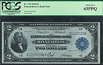 Fr.-772 This is a uncirculated example of the famous 1918 $2 Federal Reserve Bank Note commonly referred to as the Battleship because of its World War II Battleship on the reverse. This PCGS-63PPQ example hails from the popular Minneapolis District which ...