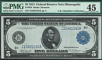 Fr.-878 1914 $5 Minneapolis (Blue Seal) FRN Ser. I15481245A PMG- 45