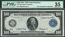 Fr.-1130L 1914 $100 San Francisco FRN (Blue Seal) Ser. L865276A PMG-35
