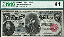 This is an outstanding example of the earlier 1878 $5 Legal Tender or commonly refered to as the Woodchopper or Pioneer note. The serail number is A5747304 and is in a GEM PCGS-65PPQ holder. It also f...