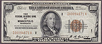 A nice circulated example of a 1929 $100 Federal Reserve Bank Note from the ever tough Minneapolis district. There are no rips, tears of pinholes. A solid VF with no soiling. The serial number is I00094671A. Minneapolis is always one of the key districts...