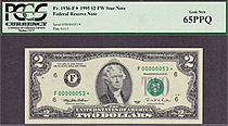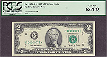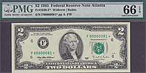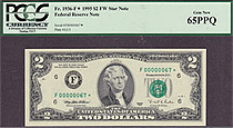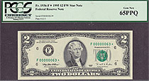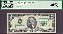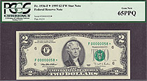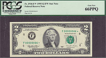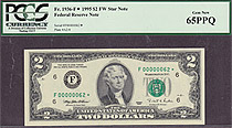 This note is part of a large collection of single and double digit 1995 $2 stars. All of them are graded by PMG or PCGS and most are in grades from 65 to 67EPQ or PPQ. If you have a favorite serial number you collect ot want a two digit $2 star for you bi...