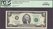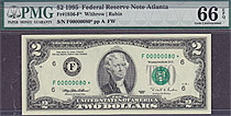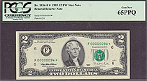 This note is part of a large collection of single and double digit 1995 $2 stars. All of them are graded by PMG or PCGS and most are in grades from 65 to 67EPQ or PPQ. If you have a favorite serial number you collect ot want a two digit $2 star for you bi...