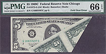 This is a very nice 3 piece error set. They are consecutive serial numbered. It is a 1977 $5 Cleveland FRN Blank Back serial number #D56592473A in a PMG-66EPQ Superb GEM holder with two bookend notes! Both bookend notes are PMG-65EPQ notes. Each note is i...