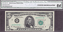 Here is a 1963 $5 Federal Reserve Note from the New York district and it is in a CGA-64 holder. The low two-digit serial number is B00000036*. It is priced to sell....
