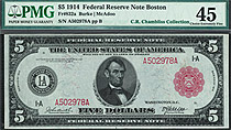 Fr.-832a 1914 $5 Boston FRN (RED SEAL) Ser. A502978A PMG-45