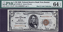 Here is the "Holy Grail" of all US Small size currency notes for your viewing pleasure. This is THE VERY FIRST 1929 $5 Federal Reserve Bank Note ever ...