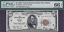 Fr.-1850K 1929 $5 Dallas FRBN Ser. # K00790571A PMG-66EPQ