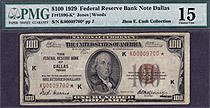 Fr.-1890K* 1929 $100 Dallas FRBN Star (2 known) Ser. # K00009700* PMG F-15