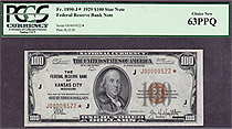 POP 2/1 finer. This 1929 $100 FRBN Star is one of only a few Uncirculated $100 Kansas City Stars known. There is one graded by PCGS that is in higher ...
