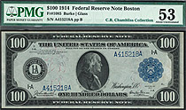 Tied for the finest known PMG graded Note. For more information on this 1914 $100 Boston FRN note please contact Jhon E Cash at 214-769-9936 or cyb...